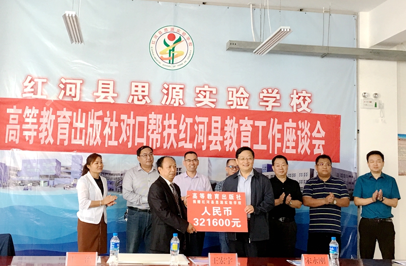 在紅河調(diào)研期間,還舉行了捐贈儀式。高教社向紅河縣捐贈總計65萬元的資金和圖書、以及300臺電腦,用于改善紅河縣基礎(chǔ)教育設(shè)備設(shè)施;向思源實驗學(xué)校捐贈32萬余元,用于購買課桌椅、雙層床架和教學(xué)設(shè)備;代表高教社員工向紅河縣紅十字會捐贈10.4萬元,作為120名貧困學(xué)生助學(xué)款。高教社全體員工,用一片愛心,一份熱誠,助力紅河脫貧攻堅任務(wù),一起迎接美好的明天。