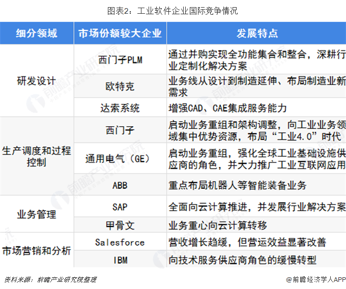 在設(shè)計(jì)軟件、實(shí)驗(yàn)驗(yàn)證軟件、生產(chǎn)流程信息化管理系統(tǒng)等相對(duì)終端較高軟件技術(shù)領(lǐng)域,西門(mén)子、博世、IBM、SAP、甲骨文、羅克韋爾等跨國(guó)公司已經(jīng)占據(jù)市場(chǎng)主導(dǎo)地位;國(guó)產(chǎn)工業(yè)軟件多為標(biāo)準(zhǔn)化通用型產(chǎn)品,對(duì)產(chǎn)品定制和二次開(kāi)發(fā)積累不足,導(dǎo)致難以滿(mǎn)足特定場(chǎng)景的需求。