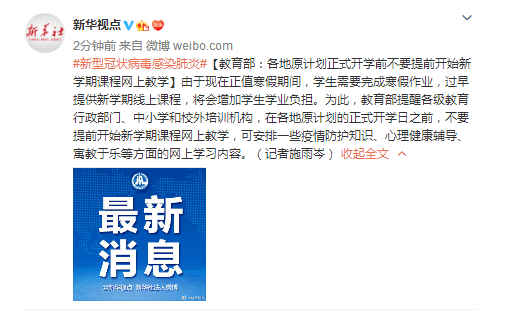 教育部:各地原計(jì)劃正式開學(xué)前不要提前開始新學(xué)期課程網(wǎng)上教學(xué)