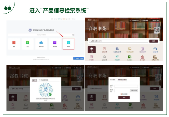 輸入網(wǎng)址http://xuanshu.hep.com.cn/,進入“產(chǎn)品信息檢索系統(tǒng)”首頁,點擊右側“電子書”模塊,進入電子書界面,點擊右上角“登錄/注冊”按鈕,選擇“掃碼登錄”或“手機驗證碼登錄”。①“掃碼登錄”操作步驟:通過微信“掃一掃”掃描頁面上的小程序碼,新用戶登錄請點擊微信界面“微信授權”→“允許”高教社用戶中心申請→“授權使用手機號”→“允許”高教社用戶中心使用→“確認登錄”;老用戶直接點擊微信界面的“確認登錄”。