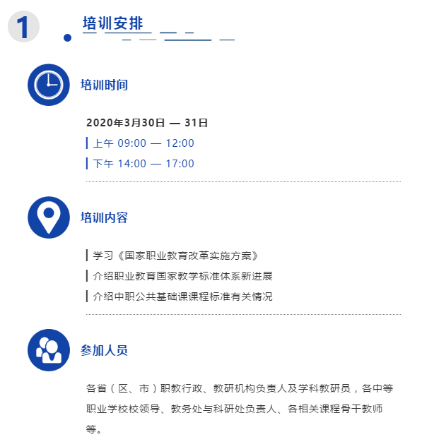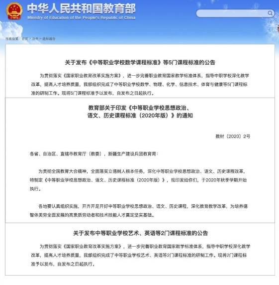 近期,教育部陸續(xù)頒布了中等職業(yè)學(xué)校思想政治、語文、歷史、數(shù)學(xué)、英語、信息技術(shù)、體育與健康、物理、化學(xué)、藝術(shù)10門公共基礎(chǔ)課的課程標(biāo)準(zhǔn)。為貫徹落實《國家職業(yè)教育改革實施方案》《關(guān)于加強和改進(jìn)新形勢下大中小學(xué)教材建設(shè)的意見》,落實立德樹人根本任務(wù),深化中等職業(yè)學(xué)?!敖處?、教材、教法”改革,幫助廣大學(xué)校和教師更好地領(lǐng)會并掌握各科課程標(biāo)準(zhǔn),決定開展中等職業(yè)學(xué)校10門公共基礎(chǔ)課課程標(biāo)準(zhǔn)培訓(xùn)。