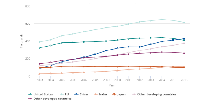 圖一是STEM教育在不同的國家的發(fā)展折線圖。我們看到桔紅的線和深藍色的線,向上走的都是像中國以及印度這樣一些國家,那么我們可以看到根據(jù)教育的研究,這些國家他們都是目前發(fā)展非??斓膰?,他們非常關(guān)注STEM的發(fā)展。
