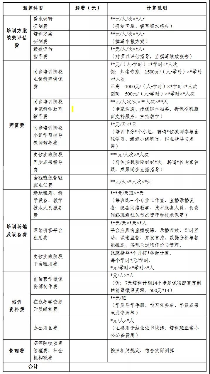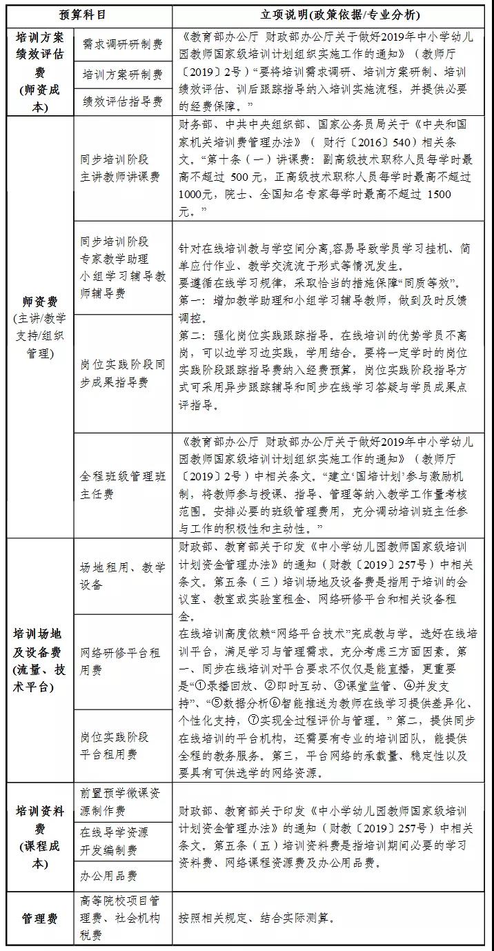 各省要依據(jù)教育部教師工作司、財務(wù)司關(guān)于印發(fā)《中小學(xué)幼兒園教師在線培訓(xùn)實施指南》的通知要求“經(jīng)費成本包括師資成本、課程使用成本、流量成本、技術(shù)平臺成本、學(xué)習(xí)支持成本、組織管理成本、管理費(稅費)成本等”。