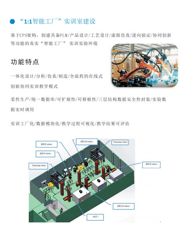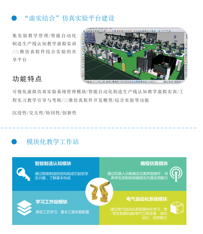 針對(duì)智能制造教育,為高等院校/中職院校全力打造智能制造創(chuàng)新教學(xué)體系建設(shè)(專業(yè)建設(shè)/師資培養(yǎng)/教學(xué)管理服務(wù)/資格證書認(rèn)定/協(xié)同創(chuàng)新教學(xué)環(huán)境搭建);提供“1:1智能工廠”實(shí)驗(yàn)室/“虛實(shí)結(jié)合”仿真實(shí)驗(yàn)平臺(tái)/數(shù)字資源及現(xiàn)代應(yīng)用技術(shù)實(shí)驗(yàn)室建設(shè),實(shí)現(xiàn)從虛擬到現(xiàn)實(shí)的智能制造實(shí)訓(xùn)教學(xué)平臺(tái)。